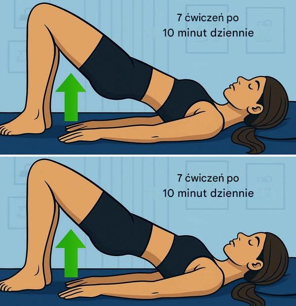 Połóż się na plecach z ugiętymi kolanami, piętami blisko pośladków i ramionami wzdłuż ciała. Unieś biodra i dociśnij pięty, aby utworzyć prostą linię między kolanami a ramionami.