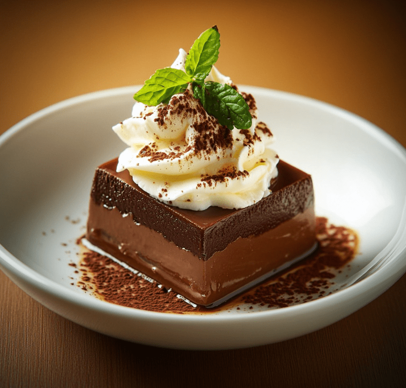 Mus z gorzkiej czekolady to klasyczny deser, który zachwyca intensywnym smakiem kakao, lekką jak chmurka konsystencją i eleganckim wyglądem. W tej wersji połączony jest z delikatnie słodzoną bitą śmietaną, aromatycznym sosem czekoladowym oraz świeżą miętą, która nadaje całości świeżości i subtelnego kontrastu. To deser idealny zarówno na wyjątkowe okazje, jak i na elegancki finał domowego obiadu.