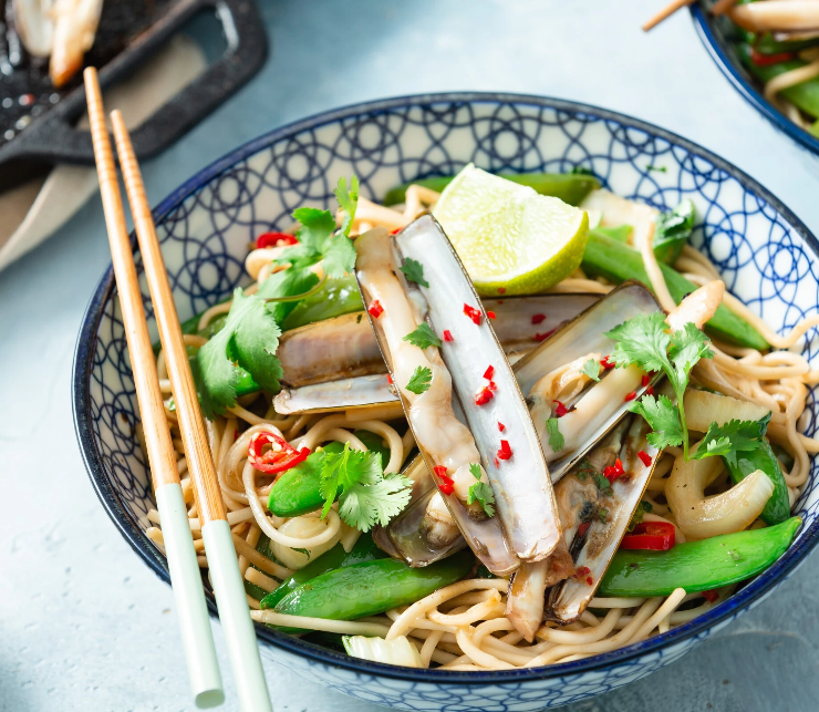 Połączenie delikatnych małży brzytew, chrupiących klusek cukrowych, aromatycznego pak choi oraz sprężystego makaronu jajecznego tworzy harmonijne danie, które doskonale sprawdzi się zarówno na elegancki obiad, jak i na wyjątkową kolację.