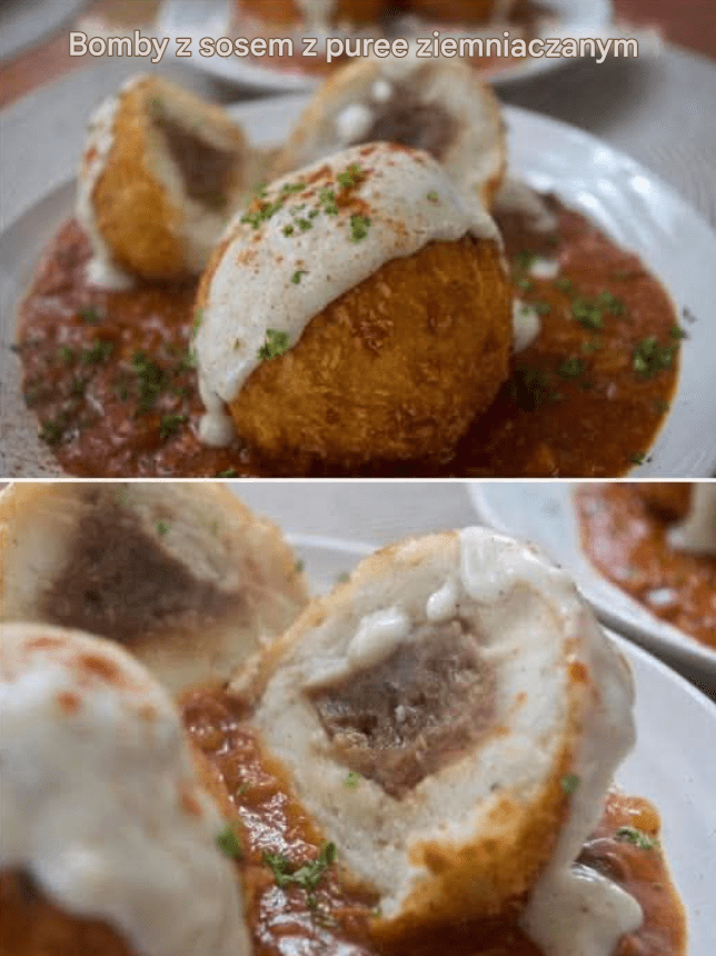 Bomby z puree ziemniaczanym i serowym bolończykiem to danie, które łączy w sobie wszystko, co najlepsze w kuchni comfort food. Chrupiące z zewnątrz, miękkie i kremowe w środku kulki ziemniaczane kryją w sobie mrożony, intensywny sos, który po smażeniu zamienia się w gorące, płynne wnętrze. Całość podawana jest na warstwie gęstego sosu bolońskiego, polana aksamitnym sosem serowym i wykończona aromatycznymi dodatkami.