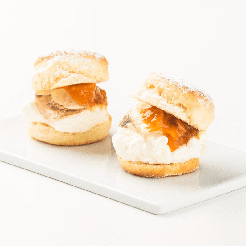 Delikatne, świeżo upieczone sconesy podawane są z domowym dżemem brzoskwiniowym, lekką i elegancką galaretką szampańską oraz hojną porcją bitej śmietany. To połączenie smaków i tekstur sprawia, że deser jest jednocześnie klasyczny i zaskakujący. Nic dziwnego, że – jak sam autor przyznaje – wszyscy goście zakochują się w nim od pierwszego kęsa.