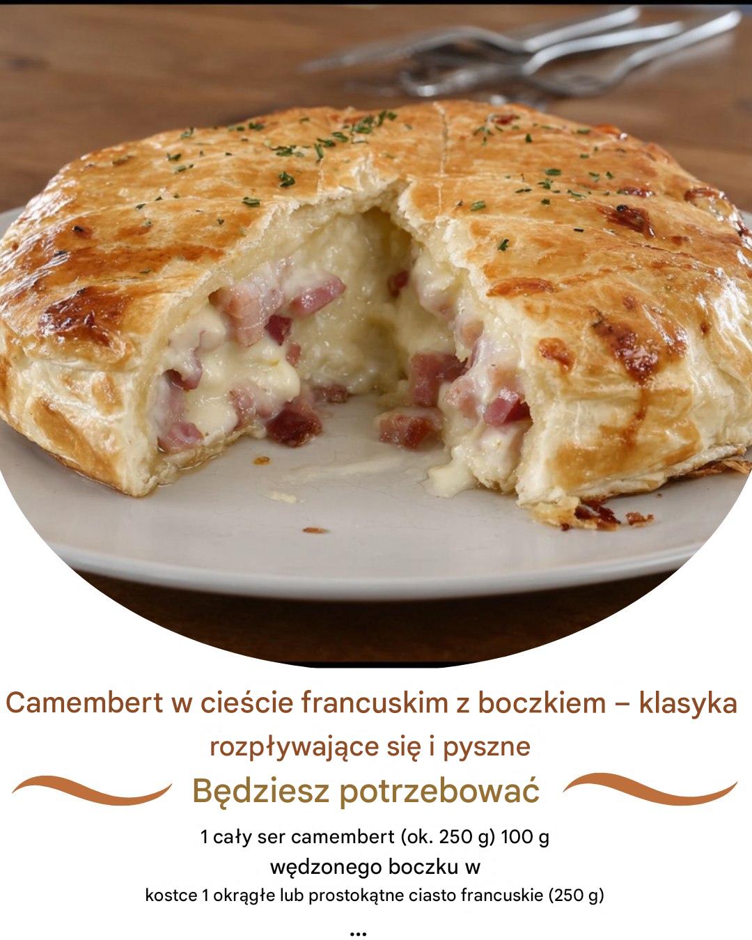 Camembert w cieście francuskim z boczkiem to proste, szybkie i niezwykle pyszne danie, idealne na niezobowiązujące spotkanie towarzyskie , rodzinny posiłek lub spotkanie z przyjaciółmi. Połączenie roztopionego sera, chrupiącego ciasta francuskiego i złocistego boczku przypadnie do gustu osobom w każdym wieku. To ciepłe i sycące danie idealnie sprawdzi się na zimowe wieczory, spontaniczne posiłki lub po prostu jako smaczna i łatwa w przygotowaniu przekąska.