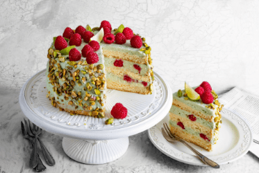 Puszyste ciasto pistacjowe z kremem i malinami