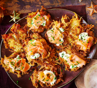 Latkes od lat kojarzone są z Chanuką, ponieważ smażenie ich na oleju symbolizuje cud światła. Jednocześnie, dzięki eleganckim dodatkom takim jak crème fraîche, szczypiorek i wędzony łosoś, doskonale pasują do świątecznego, bożonarodzeniowego stołu. Podane jako małe kanapki lub wykwintna przystawka, zachwycają zarówno prostotą, jak i smakiem.