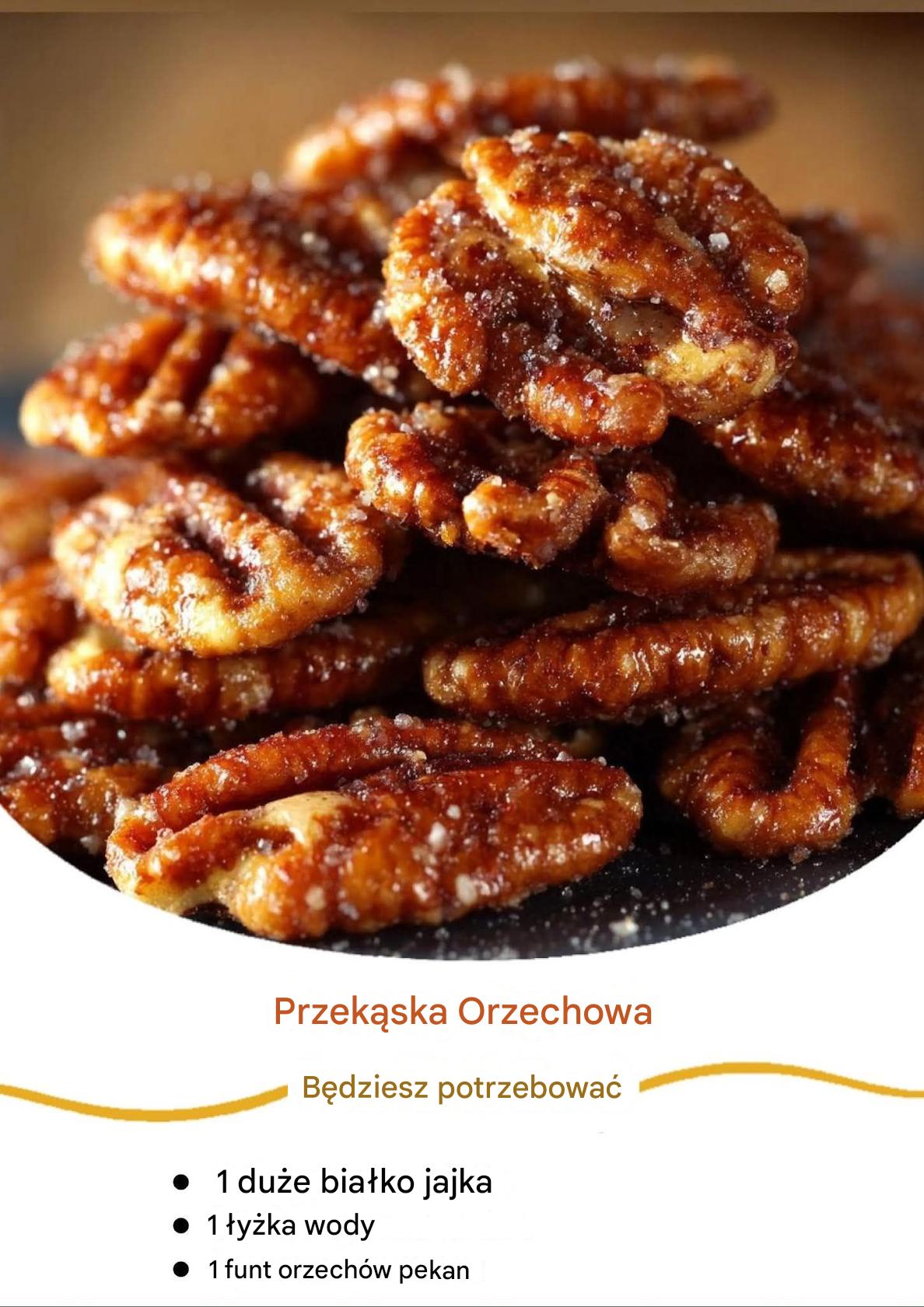 Orzechy pekan obtoczone w lekkiej, puszystej mieszance białka jajka, a następnie delikatnie pieczone w niskiej temperaturze, zyskują cienką, chrupiącą skorupkę. Cukier i cynamon tworzą harmonijną, korzenną słodycz, a subtelna nuta soli podkreśla naturalnie maślany smak orzechów. Efektem jest przekąska, która znika błyskawicznie – niezależnie od tego, czy podasz ją gościom, zapakujesz jako domowy prezent, czy będziesz delektować się nią w spokojne popołudnie.