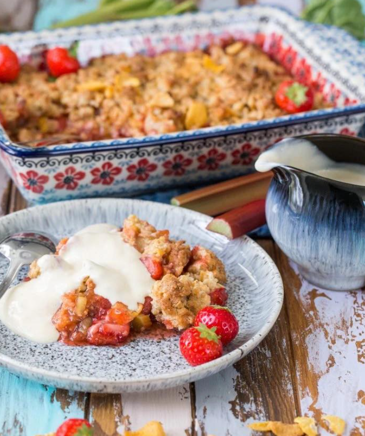 Ciasto z rabarbarem i truskawkami to klasyka, która zawsze smakuje wyśmienicie, szczególnie w połączeniu z chrupiącą kruszonką. W tej wersji zamiast tradycyjnej kruszonki, użyłam płatków kukurydzianych, które nadały ciastu wyjątkowej tekstury i smaku. Jest to idealny deser na letnie dni, kiedy rabarbar i truskawki są w pełni sezonu. Ciasto jest nie tylko pyszne, ale także łatwe do przygotowania, a połączenie kremowego nadzienia z chrupiącą kruszonką z płatków kukurydzianych to coś, czego trzeba spróbować!