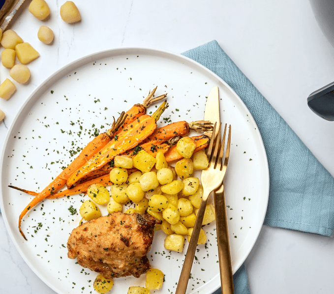 Cordon bleu z marchewką w sosie miodowo-musztardowym i młodymi ziemniakami z frytkownicy to pyszna interpretacja klasycznego dania typu AVG, czyli połączenia ziemniaków, mięsa i warzyw. Dzięki wykorzystaniu frytkownicy powietrznej potrawa zachowuje pełnię smaku, a jednocześnie jest lżejsza i bardziej nowoczesna w przygotowaniu. To propozycja idealna na rodzinny obiad, kiedy zależy nam na znanych smakach w nieco odświeżonej formie.