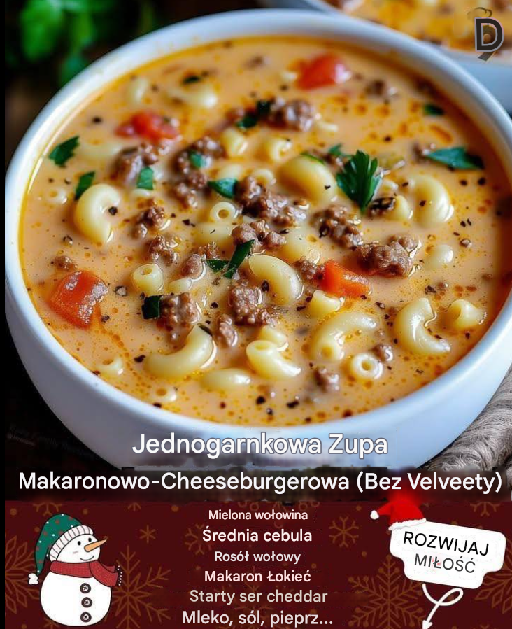 Zupa makaronowa z cheeseburgerem w jednym garnku to idealne połączenie klasycznego, dobrze znanego smaku cheeseburgera z rozgrzewającą, kremową zupą. To danie, które kojarzy się z domowym komfortem, sytością i prostotą, a jednocześnie potrafi zaskoczyć bogactwem smaku przy użyciu zaledwie kilku podstawowych składników.