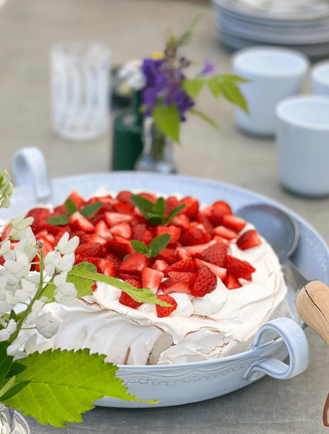 Klasyczna, duża i letnia Pavlova nadziewana bitą śmietaną z dodatkiem greckiego jogurtu i udekorowana świeżymi truskawkami. To deser, który zawsze robi wrażenie i smakuje wyśmienicie w ciepłe dni!