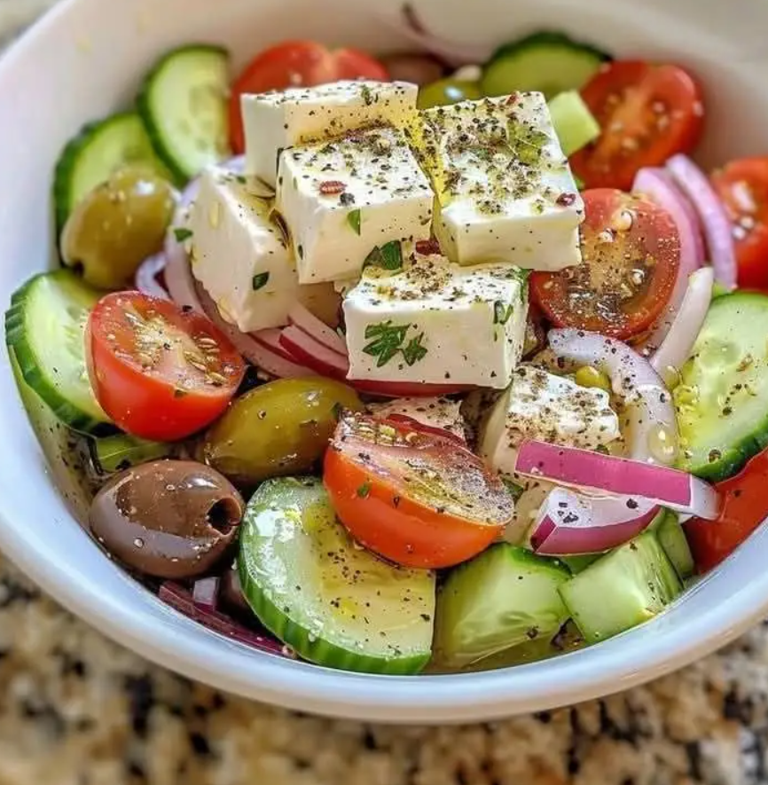 Każdy kęs to idealna równowaga: chrupiący ogórek kontrastuje z soczystymi pomidorami, słone oliwki z wyrazistą fetą, a aksamitna oliwa z oliwek z lekko kwaskowym akcentem octu.