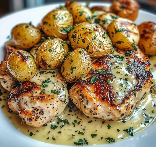 Kremowe ziemniaki z kurczakiem i czosnkiem to danie, które natychmiast rozgrzewa, syci i zachęca do jedzenia już od pierwszego spojrzenia. Delikatne piersi kurczaka, smażone na patelni na złoty kolor, zanurzone są w jedwabistym sosie śmietanowo-czosnkowym, wzbogaconym parmezanem oraz musztardą Dijon. Całość dopełniają pieczone młode ziemniaki – chrupiące na zewnątrz i puszyste w środku – aromatyzowane czosnkiem i ziołami.