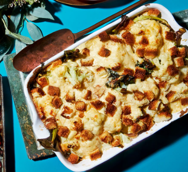 Całość dopełniają chrupiące kawałki brioszki oraz złocista warstwa sera, które po zapieczeniu tworzą kontrast między kremowym wnętrzem a przyjemnie zapieczoną powierzchnią. To danie, które łączy prostotę składników z elegancją smaku, a przy tym doskonale sprawdza się zarówno jako dodatek do mięs, jak i samodzielna propozycja dla miłośników warzywnych potraw.