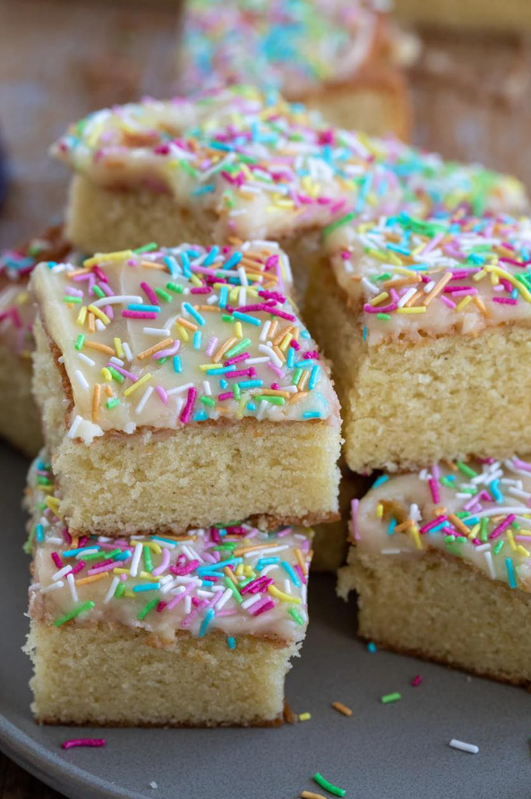 Kwadraty z posypką to prawdziwa klasyka i uważam, że klasyka nigdy nie byłaby klasyką, gdyby wielu ludziom nie smakowała 🙂 Soczyste, miękkie ciasto z wanilią, polane polewą z masła i cukru pudru, posypane ulubionymi posypkami! PYCHA!