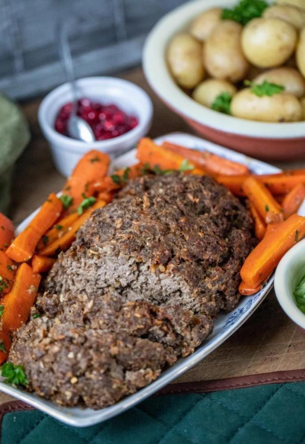 Kiedy dziadek Rune jeszcze żył, powiedział mi, że muszę spróbować pieczeni mięsnej, którą robił z francuską zupą cebulową – była niesamowicie prosta i pyszna. Powtarzał to kilka razy, a ja zapomniałam o tym aż do tego tygodnia! Minęło wiele lat, odkąd odszedł, i to zabawne, że tak wyraźnie pamiętam, jak opowiadał o tej pieczeni. To najprostsza pieczeń mięsna, jaką można sobie wyobrazić – trzy składniki zmieszane razem i tadaaaa, i masz naprawdę smaczną i pyszną pieczeń! Zupę cebulową można znaleźć wśród zup w proszku w sklepie. Wyszukałam przepis w Google i okazało się, że czasopismo Buffé opublikowało go w 2003 roku, więc możliwe, że przepis pochodzi właśnie stamtąd albo autorzy przepisu pochodzą od dziadka 🙂 Tak czy inaczej, danie jest tak pyszne, że delektowałam się wieloma pysznymi dodatkami.