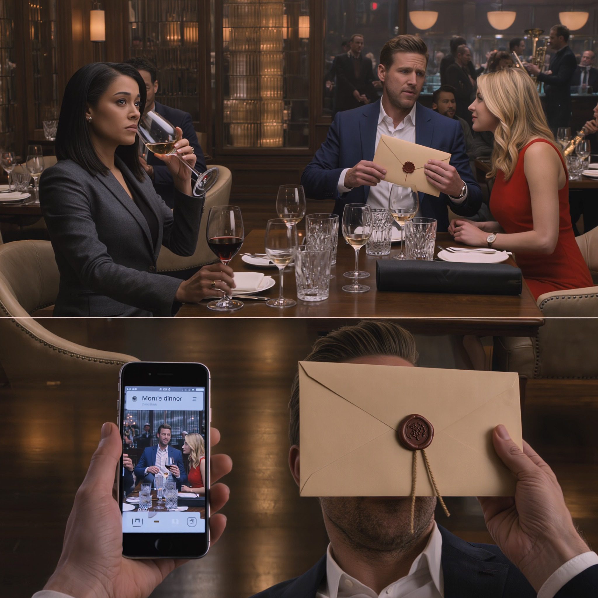 To była zapieczętowana woskiem koperta przesuwająca się po stole w kierunku kobiety ubranej na czerwono.