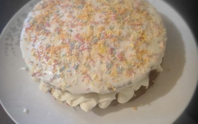 Świąteczne ciasto waniliowe z kremem i kolorową posypką