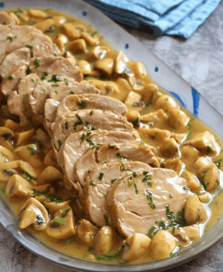 - Pokrój pieczeń w cienkie plasterki i hojnie polej ją sosem grzybowym.