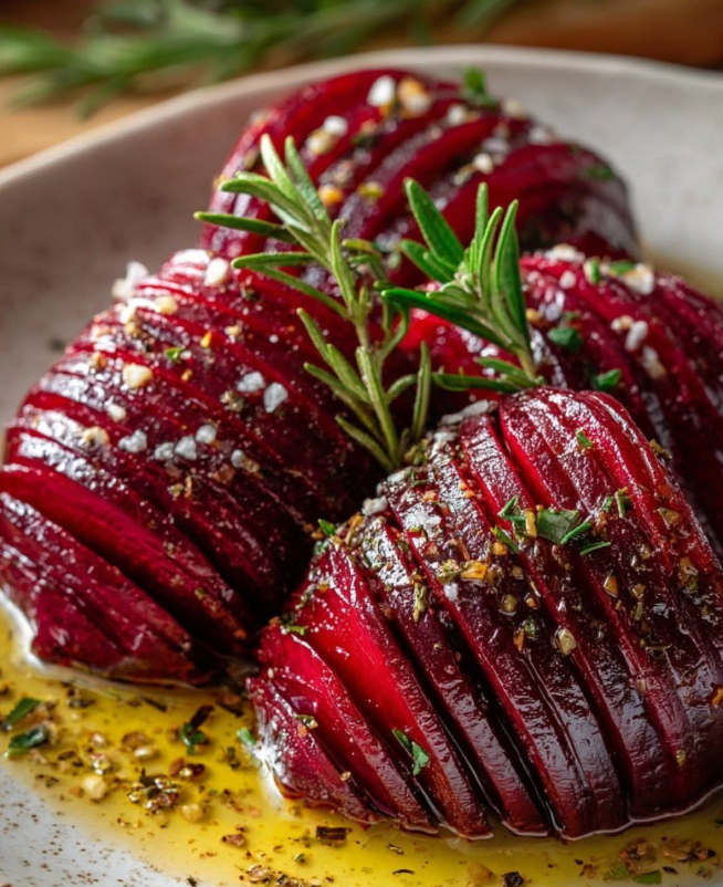 Powoli pieczone w piekarniku buraki zyskują głęboką, naturalną słodycz i delikatnie ziemisty charakter. W połączeniu z aromatycznym masłem czosnkowym oraz suszonymi ziołami tworzą harmonijną całość, która przywodzi na myśl domową kuchnię babci, a jednocześnie zachwyca elegancją prostego podania.