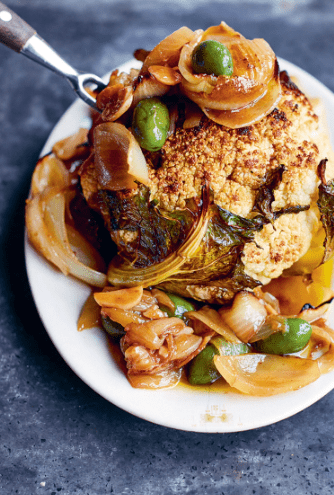 Ten pieczony kalafior to prawdziwie spektakularne danie, które udowadnia, że warzywa mogą grać pierwsze skrzypce na stole. Duża, soczysta główka kalafiora traktowana jest tutaj z taką samą uwagą i troską, jak najlepszy kawałek mięsa. Długi czas pieczenia, aromatyczna zalewa i starannie dobrane dodatki sprawiają, że całość nabiera głębi, intensywności i elegancji.
