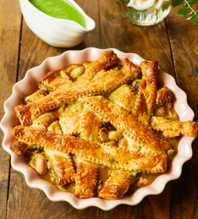 Ten prawdziwy pasztet z kurczaka w kruchym cieście to klasyczne, domowe danie, które doskonale sprawdzi się jako posiłek do dzielenia się z rodziną i przyjaciółmi. Ma wszystko, czego można oczekiwać od porządnego, sycącego wypieku: maślane, kruche ciasto, delikatne kawałki kurczaka z wolnego wybiegu oraz por i warzywa zanurzone w kremowym, aromatycznym sosie na bazie cydru. Podany prosto z pieca w naczyniu do zapiekania robi wrażenie zarówno wyglądem, jak i smakiem.