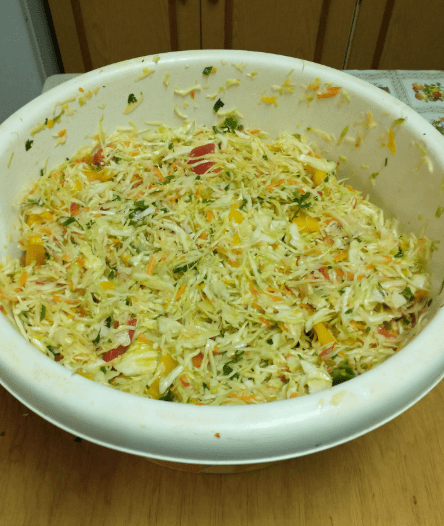 Miałam małe 4-y główki kapusty słodkiej, 3-y marchewki, 3-y papryki żółte, 3-y czerwone, pęczek natki pietruszki. Zalewa.