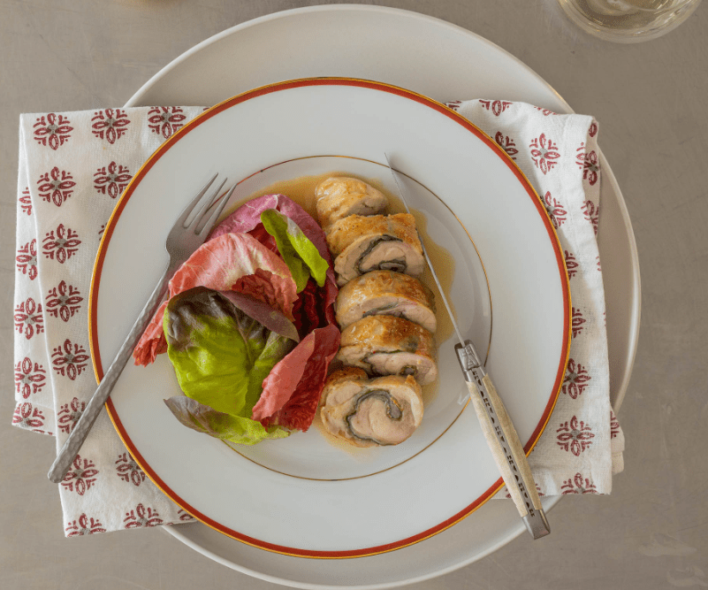 Tradycyjnie lardo podaje się na ciepłych grzankach lub wykorzystuje do owijania dziczyzny. W tym przepisie pozwalamy jednak, by kilka niemal papierowych plasterków rozpuściło się w sosie z patelni, nadając głębi i dekadencji roladzie z kurczaka inspirowanej klasyczną roladą z królika — bez konieczności sięgania po królika.