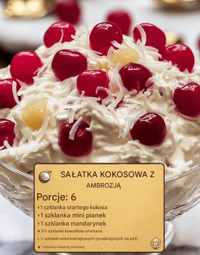 Sałatka kokosowa Ambrosia to kultowa sałatka deserowa, uwielbiana od pokoleń i głęboko zakorzeniona w domowej tradycji. Lekka, kremowa, owocowa i subtelnie orzechowa, od lat pojawia się na rodzinnych stołach podczas świąt, spotkań towarzyskich oraz niedzielnych obiadów. Jej urok tkwi w prostocie, a jednocześnie w niezwykle harmonijnym połączeniu smaków i tekstur.