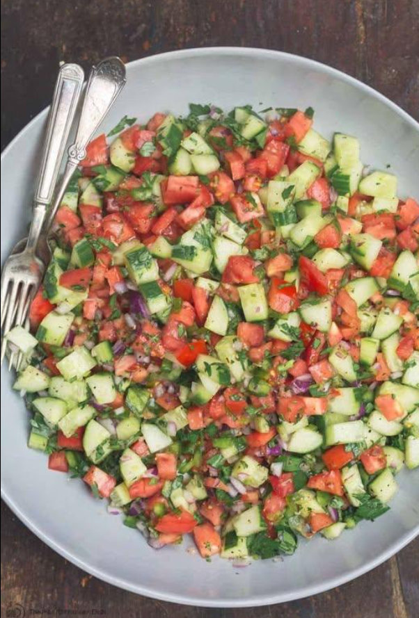 - 1️⃣ Krojenie warzyw: Pokrój ogórki i pomidory w małą kostkę. Posiekaj czerwoną cebulę, pietruszkę i miętę.