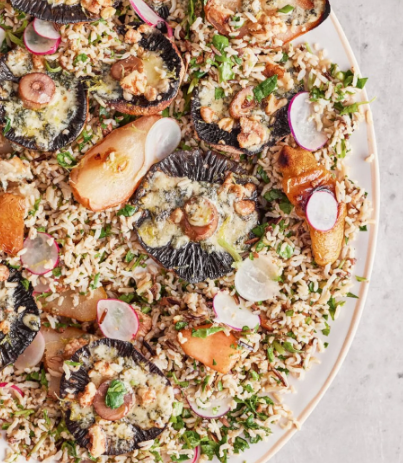 Połączenie pieczarek portobello, słodkich gruszek, wyrazistego sera pleśniowego oraz orzechów włoskich tworzy harmonijną kompozycję smaków – od ziemistych i głębokich, przez słodkie, aż po lekko pikantne i kremowe. Całość dopełnia ryż basmati i dziki, który nadaje sałatce treściwości, oraz mieszanka rzeżuchy, szpinaku i rukoli, wnosząca świeżość i delikatną ostrość.