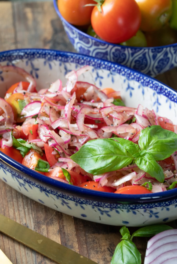 Prosta i szybka sałatka z pomidorów i cebuli to doskonały wybór na ciepłe dni. Jej smak jest świeży i intensywny, a połączenie czerwonej cebuli z oliwą, octem i bazylią tworzy wyjątkową harmonię smaków. Idealna jako dodatek do grilla, mięs lub samodzielne danie.