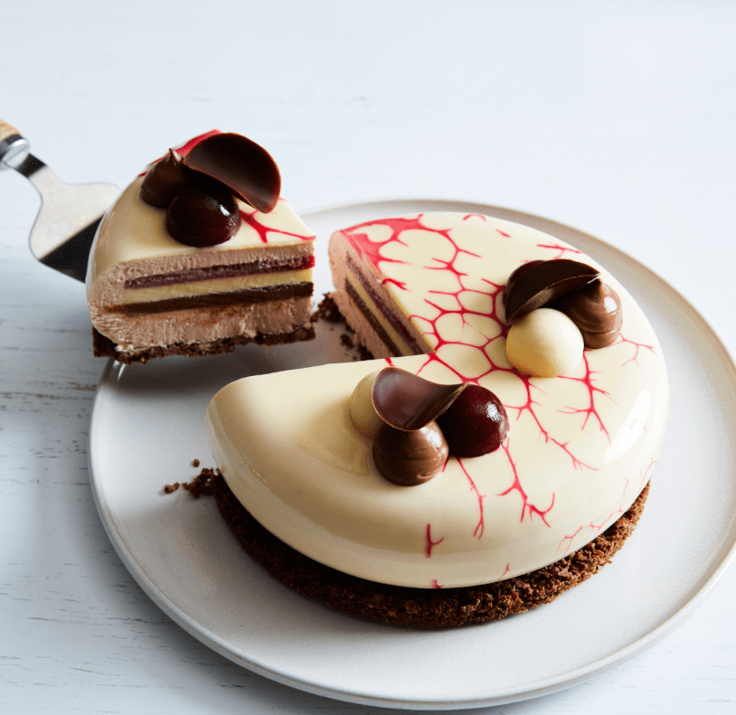 Sernik Biały Las to wyjątkowy, nowoczesny deser inspirowany klasycznymi połączeniami czekolady, wiśni i wanilii, ale podany w wyrafinowanej, warstwowej formie. Jego znakiem rozpoznawczym jest tzw. wkładka – precyzyjnie przygotowany zestaw zamrożonych kremów ukrytych wewnątrz masy sernikowej, które po przekrojeniu tworzą idealnie równe, kontrastujące warstwy.