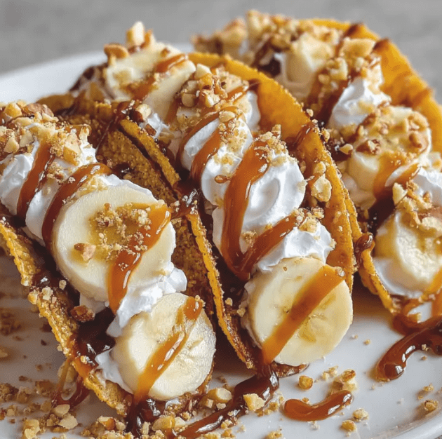 Tacos z karmelem, bananem i orzechami to jeden z tych deserów, które od razu wywołują ciekawość i uśmiech. Są zabawne w formie, lekko nostalgiczne w smaku i niezwykle przyjemne w jedzeniu, a przy tym nie wymagają długiego stania w kuchni ani skomplikowanych technik. Chrupiące skorupki tacos zamieniają się tutaj w słodkie naczynie, wypełnione miękkimi plasterkami banana, puszystą bitą śmietaną, chrupiącymi orzechami i obfitą porcją złocistego karmelu.