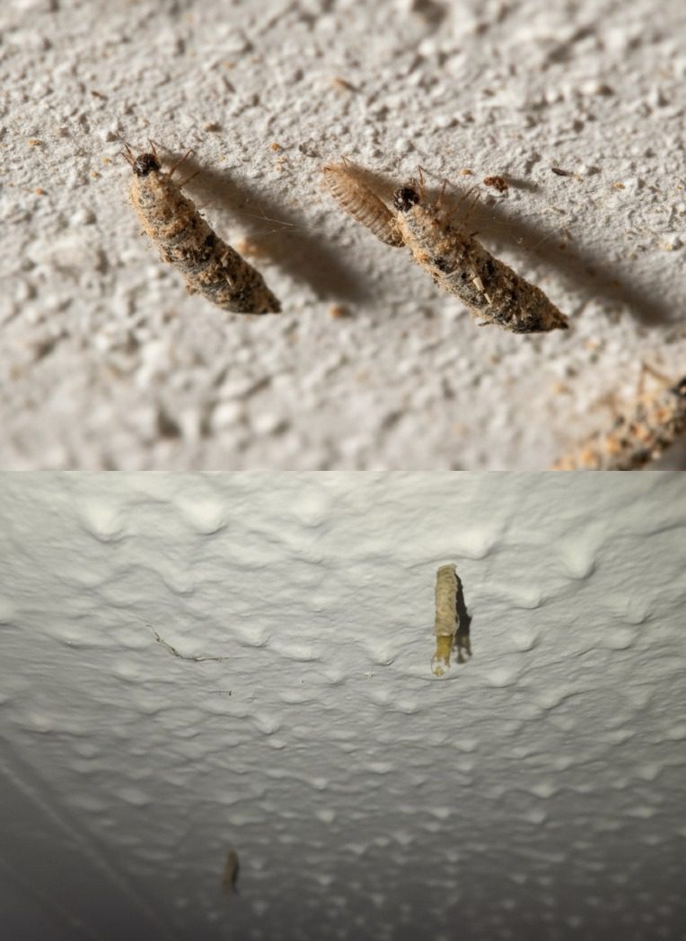 Jak wyglądają: Niewielkie ćmy o chaotycznym locie; larwy pozostawiają cienkie, pajęczynowate ślady na ścianach i sufitach.