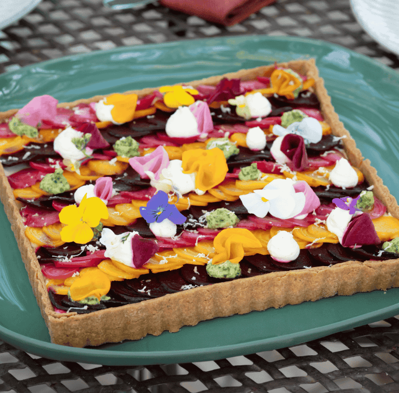 Tarta z buraków to wyrafinowane, a jednocześnie pełne naturalnej energii danie, które zachwyca zarówno smakiem, jak i wyglądem. Połączenie pieczonych czerwonych, złotych i białych buraków tworzy na talerzu prawdziwą paletę barw, a ich ziemisty, głęboki smak zostaje podkreślony przez kremowy krem chrzanowy oraz aromatyczne pesto z liści buraka.