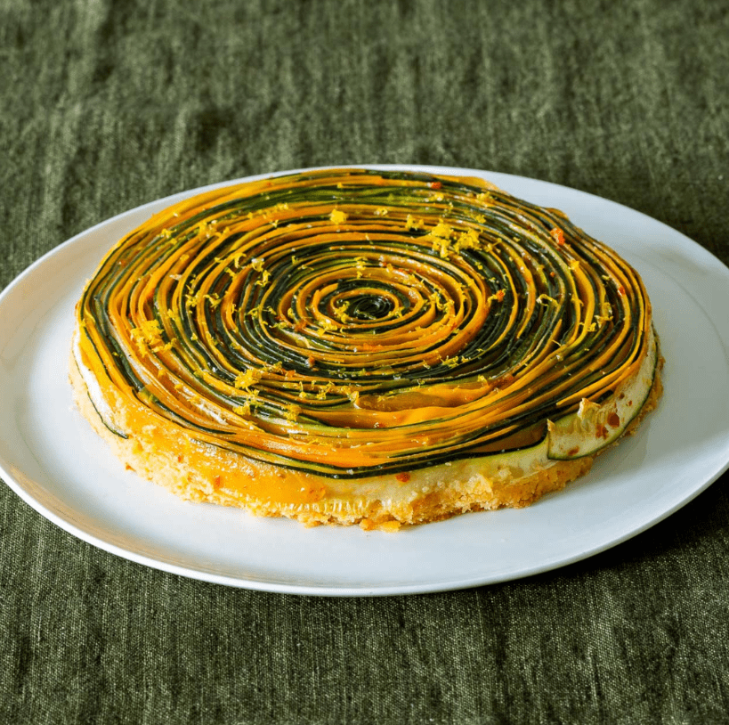 Do jej przygotowania używam dwóch moich ulubionych warzyw: cukinii i marchewki. Oba kroję w bardzo cienkie plasterki na mandolinie, co pozwala uzyskać równą strukturę i piękny wzór po upieczeniu. Następnie układam je w małym „systemie narzędzi”, który stworzyłam z dostępnych w kuchni obręczy i foremek.