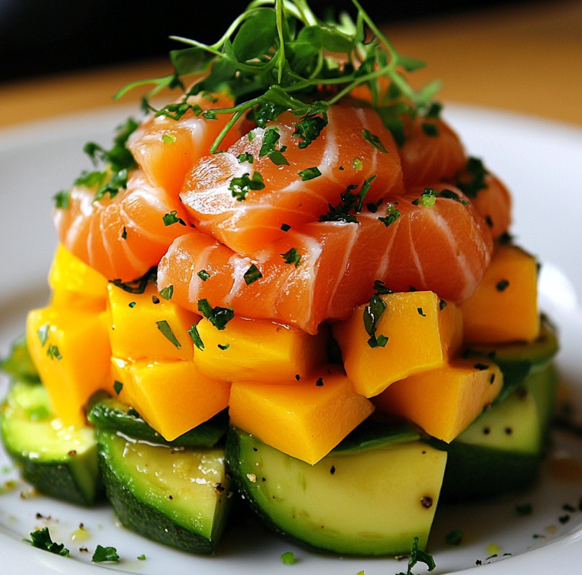 Surowy tatar z łososia z mango i ogórkiem to wyrafinowana, a jednocześnie niezwykle świeża propozycja, która doskonale sprawdzi się jako lekka przystawka lub eleganckie danie na specjalną okazję. Połączenie delikatnego, surowego łososia z soczystym mango, chrupiącym ogórkiem i kremowym awokado tworzy harmonijną kompozycję smaków i tekstur, w której każdy składnik odgrywa jasno określoną rolę.