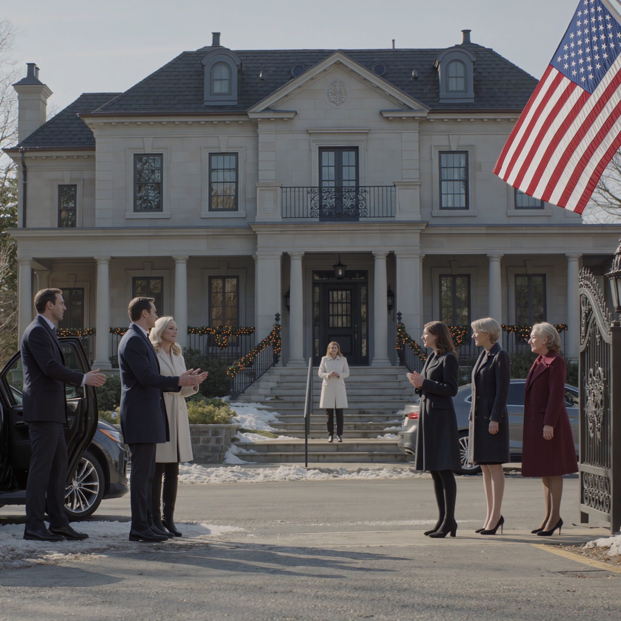 Następnie z auta wyszła Jessica, szepcząc mu coś do ucha i wskazując na szczegóły posiadłości.