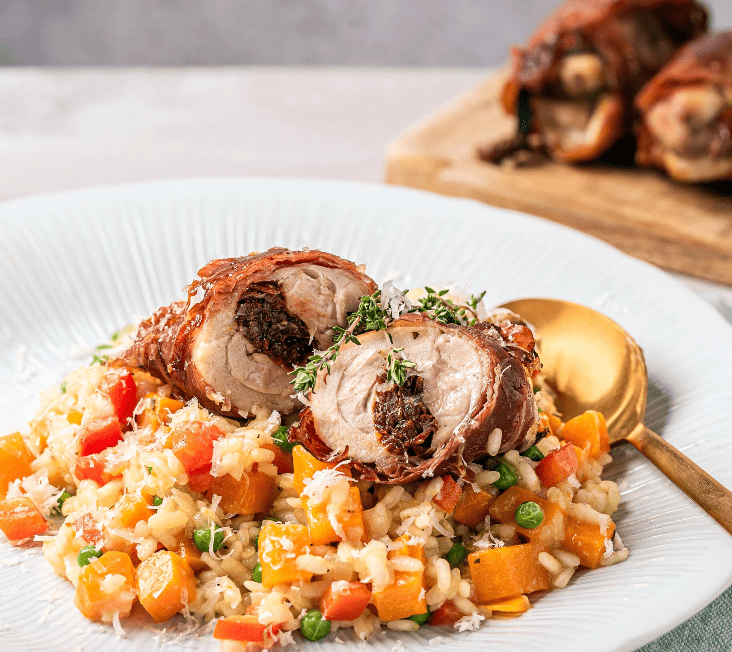Dzięki połączeniu delikatnych warzyw, boczniaków, ziół i parmezanu risotto nabiera głębokiego smaku, a faszerowane udka z dodatkiem suszonych pomidorów, oregano i szynki parmeńskiej stanowią doskonałe uzupełnienie całości. To danie sprawdzi się zarówno na rodzinny obiad, jak i na elegancką kolację.