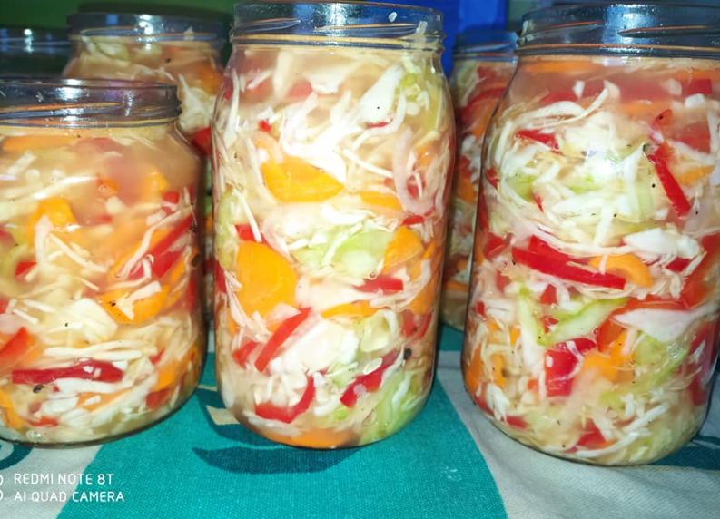 Pyszna sałatka na zimę z 1 kapusty,5 ogórków (można dać cukinie), 5papryk,5cebuli, czosnku 1,5 główki , 6marchewek. Wszystko pocięłam dodałam 2 szklanki octu,3 szklanki cukru,1 szklanka oleju,