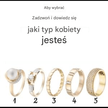 Spójrz na pięć pierścionków poniżej (lub wyobraź sobie je, jeśli nie ma zdjęcia) i wybierz bez wahania ten, który najbardziej Ci się podoba. Następnie odkryj, co Twoje wybory mówią o Tobie. Gotowa? Zaczynajmy!
