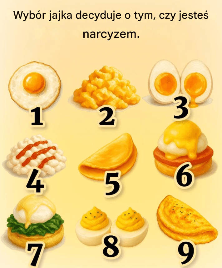 Jajka są jednym z najbardziej uniwersalnych produktów śniadaniowych. Można je przygotować na dziesiątki sposobów, a każdy z nich wywołuje inne skojarzenia. Przyjrzyj się dziewięciu formom przygotowania jajek. Wybierz tę, która instynktownie najbardziej Ci się podoba – nie tę, która „wypada najlepiej”, lecz tę, która naprawdę do Ciebie przemawia. Następnie sprawdź, co ten wybór może mówić o Twojej osobowości i czy kryje się w nim choć cień narcyzmu.