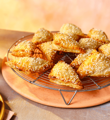 Te złociste, chrupiące bourekas to klasyczna propozycja, która doskonale sprawdzi się na żydowskie święta, rodzinne spotkania lub jako efektowna przekąska do dzielenia się przy stole. W tej wersji delikatne ciasto francuskie kryje w sobie kremowe, wyraziste nadzienie z trzech serów, które po upieczeniu staje się miękkie i aromatyczne, kontrastując z chrupiącą skorupką.