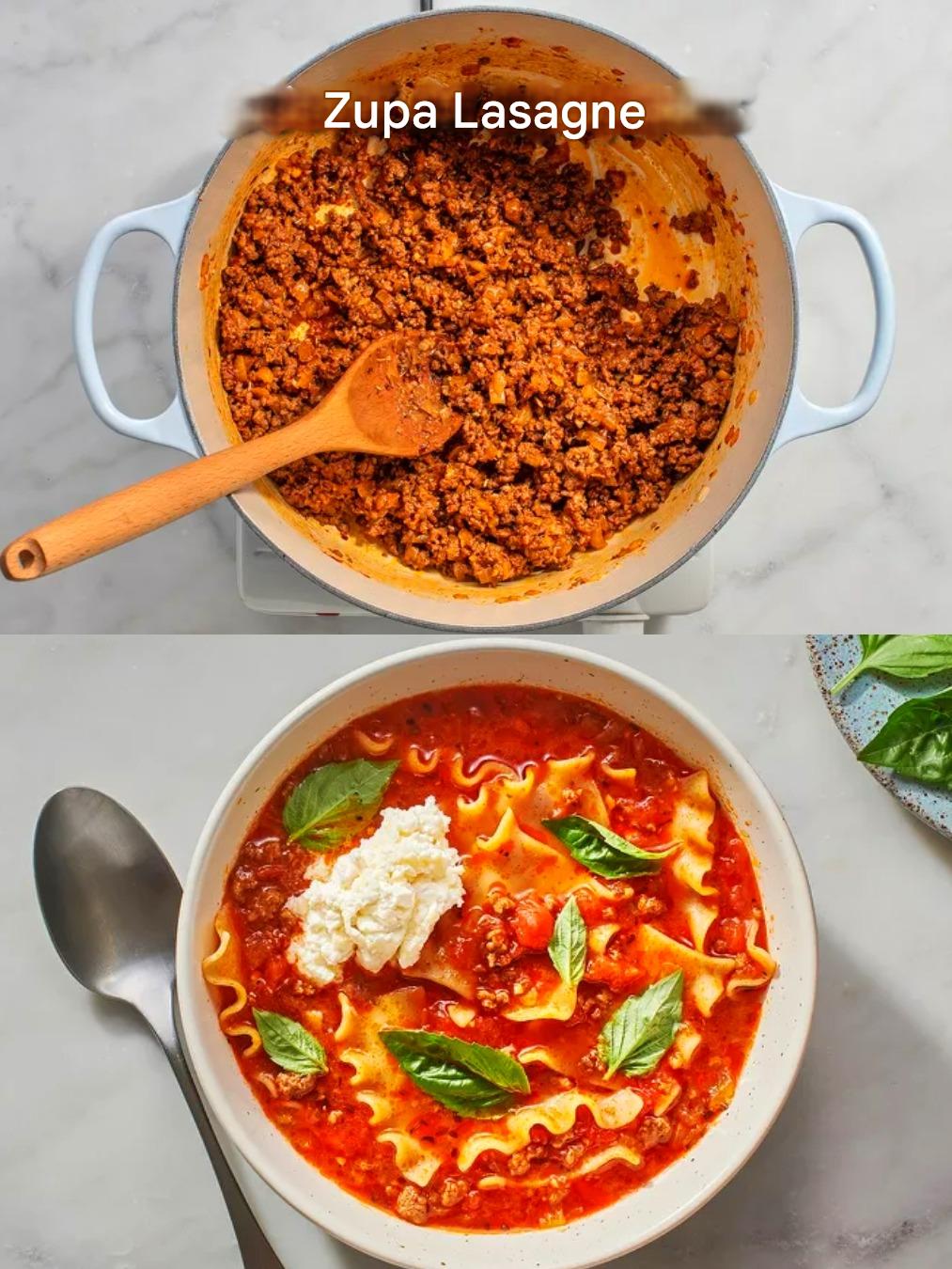 Zupa lasagne to sycące, aromatyczne i rozgrzewające danie, które zamienia wszystkie ukochane smaki klasycznej lasagne w wygodną formę jednogarnkowej zupy. Znajdziesz tu wszystko, co najlepsze w tradycyjnej wersji: mieloną wołowinę, pomidory, zioła, makaron lasagne oraz kremową mieszankę serów ricotta i mozzarella, która rozpływa się na wierzchu.