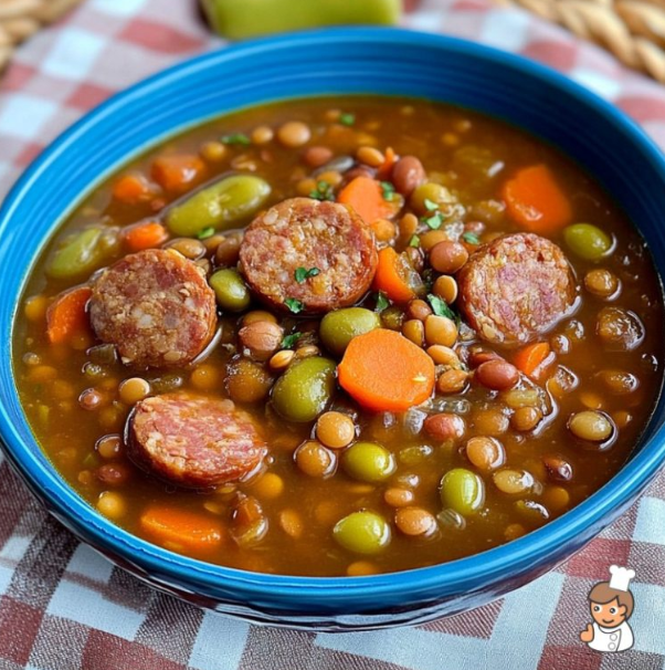 Ten przepis jest prosty i uporządkowany: najpierw przygotowujesz składniki, potem podsmażasz chorizo, aby uwolnić aromat, a następnie na tym samym tłuszczu zmiękczasz warzywa. Dzięki temu zupa zyskuje głębię bez konieczności stosowania skomplikowanych technik. Na końcu wszystko spokojnie się gotuje, aż soczewica stanie się miękka, a smaki ładnie się połączą. Opcjonalne zielone oliwki dodają przyjemnej, lekko słonej kontrnuty, która może świetnie podkręcić charakter dania.